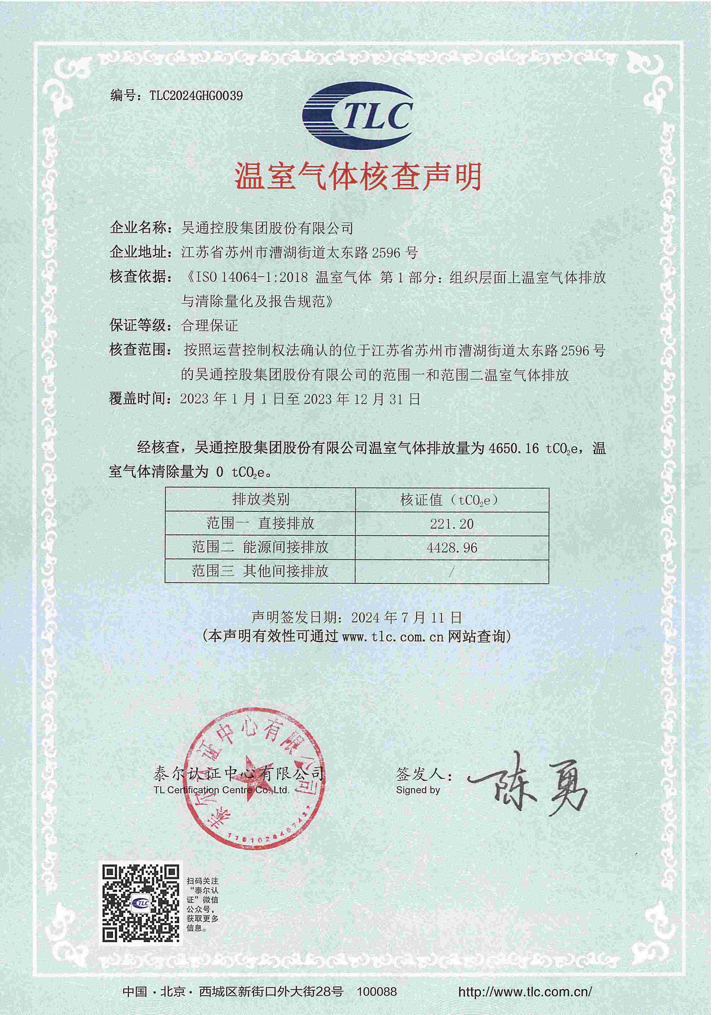 近期,公司取得由第三方认证公司核查并授予的《温室气体核查声明》证书,此次核查过程严格依据《ISO 14064-1:2018温室气体 第1部分:组织层面上温室气体排放与清除量化及报告规范》开展,2023年公司温室气体排放总量为4650.16 tCO2e,核查声明公示如下: